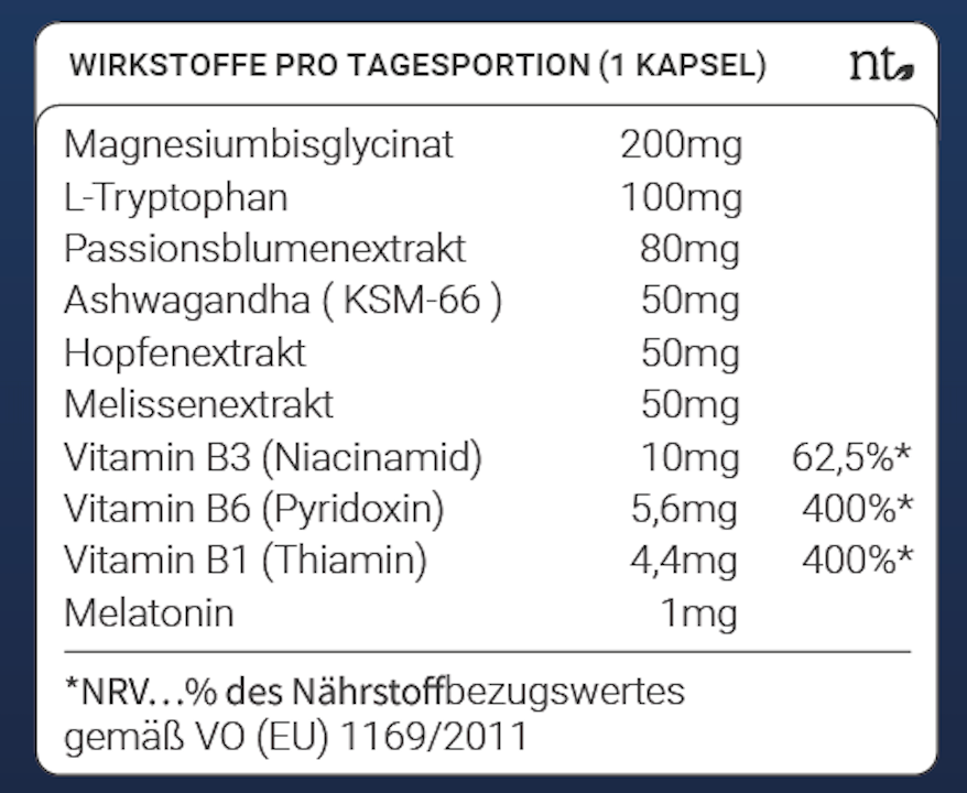 Magnesium, Passionsblume, Melisse, L-Tryptophan und B Vitamine helfen Dir dabei Körper & Geist zu entspannen.